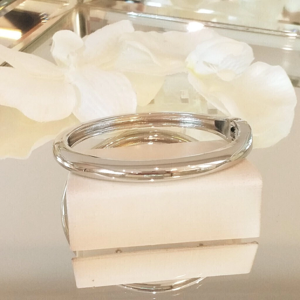 Bracelete liso de metal banhado em ródio e verniz de proteção.