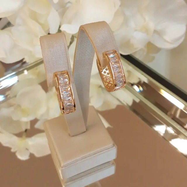 Belíssimo brinco de argola com zircônias na forma de baguete.