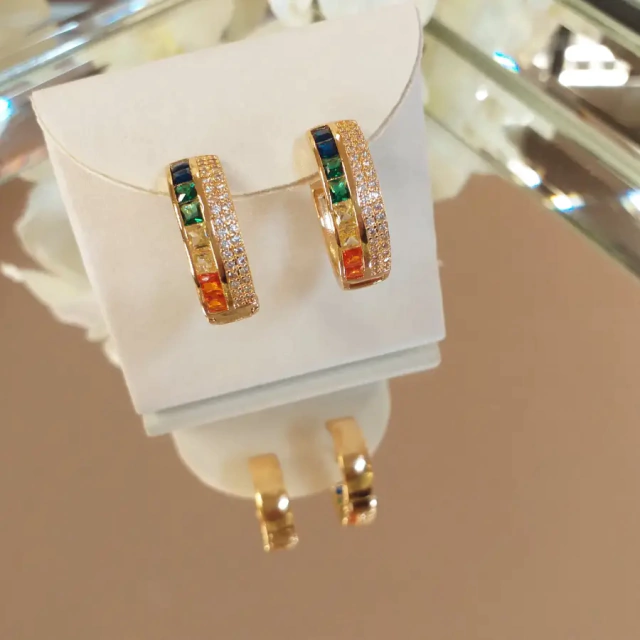 Brinco de argola com microcravação em zircônias cristal e fileira de mini carrés coloridas.