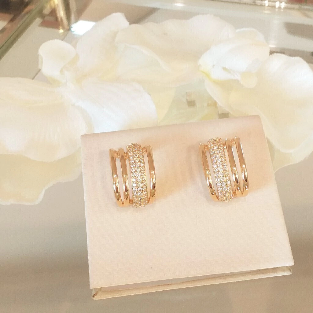 Brinco de linhas de metal e zircônia.Semijoias banhadas em ouro 18k e verniz especial de proteção.