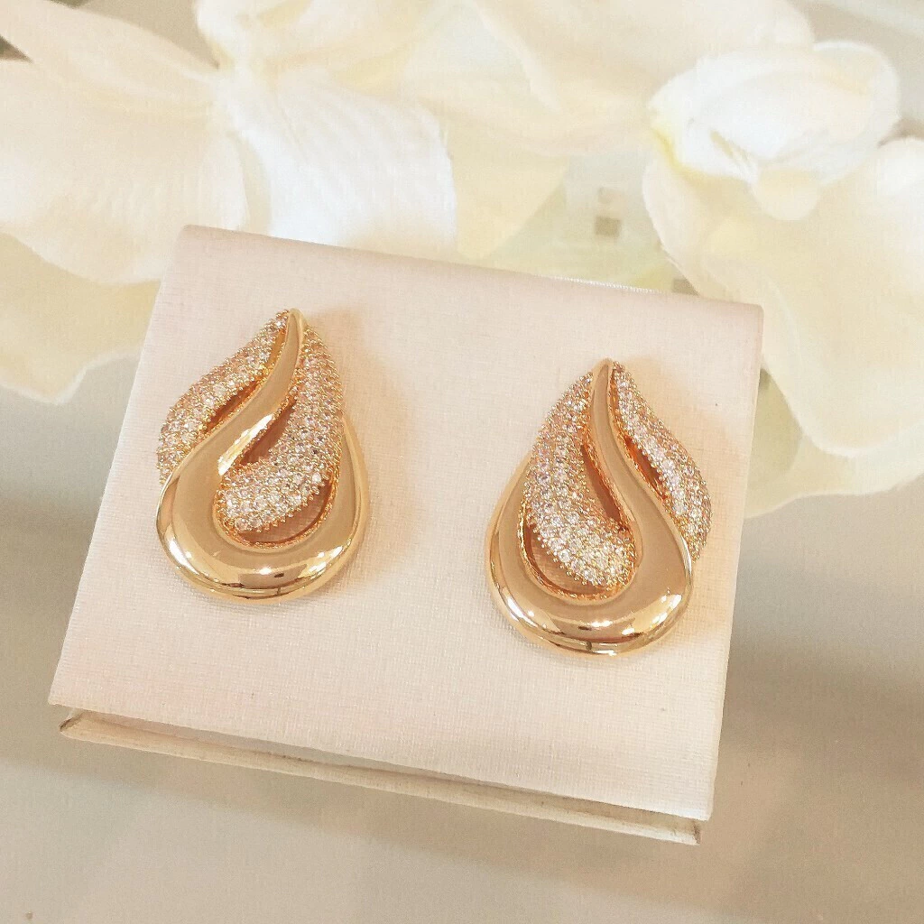 Lindo brinco de gotas entrelaçadas de metal e zircônias.Semijoias banhadas em ouro 18k e verniz especial de proteção.