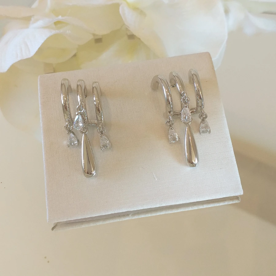 Brinco de metal e zircônia com gotinhas banhado em ródio e verniz de proteção.