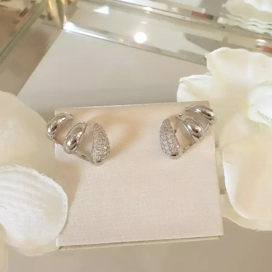 Brinco argola estilo duplo piercing fake com linha de zircônia banhado em ródio branco.