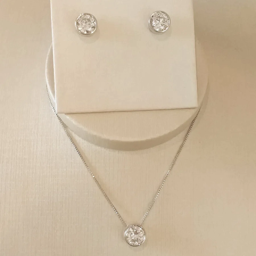 Conjunto de colar e brincos de ponto de luz com cravação inglesa banhado em ródio branco
