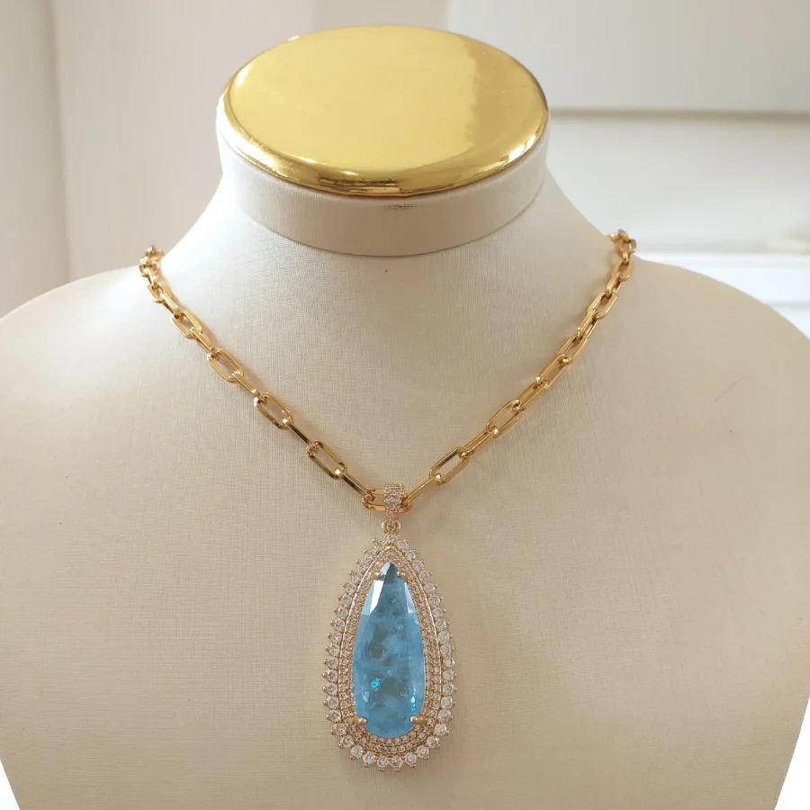 Colar em zircônia fusion água marinha banhado em ouro 18k