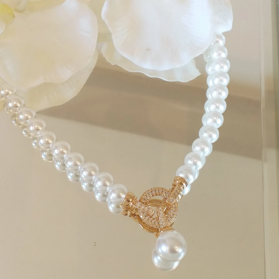 Colar de pérola com fecho em zircônia banhado em ouro 18k e verniz de proteção.