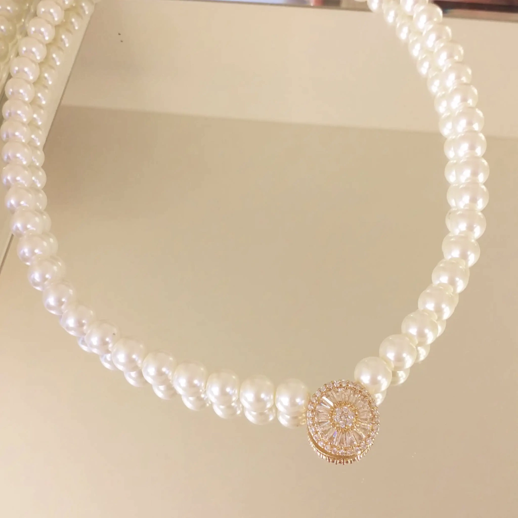 Colar de pérola de murano com pingente redondo de zircônias.