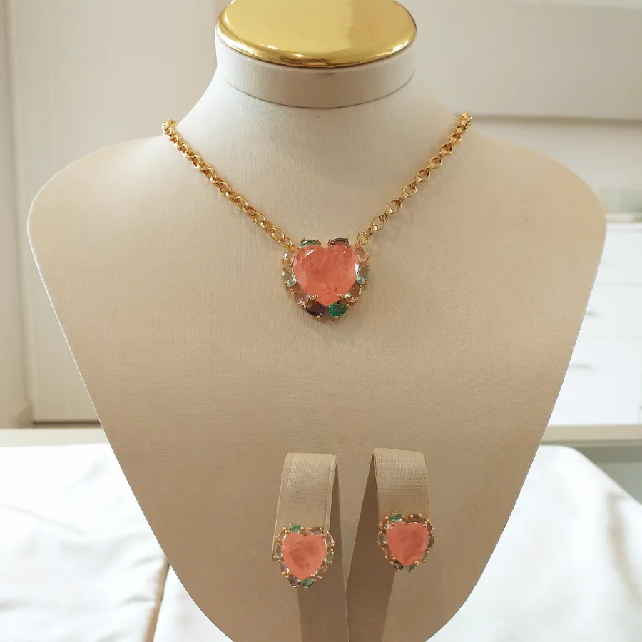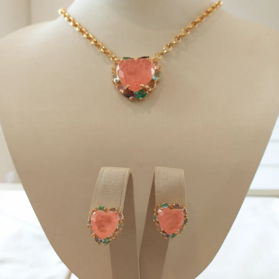 Conjunto de colar e brincos em zircônia fusion de coração morganita e rainbow banhado em ouro 18k