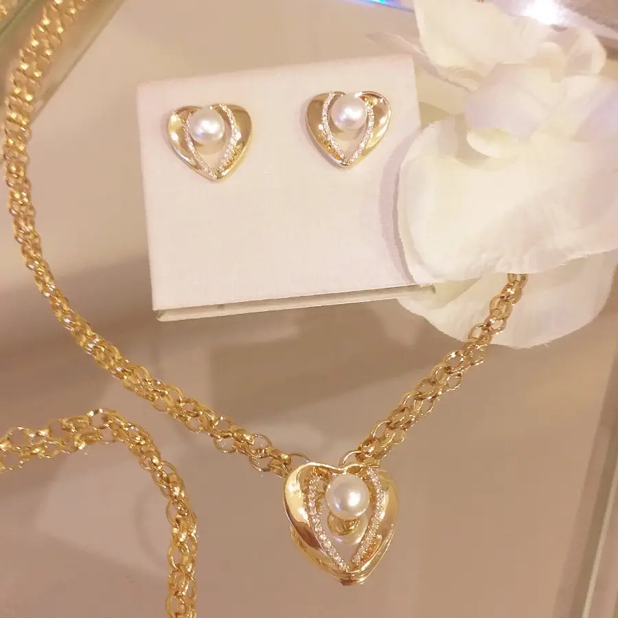 Lindo conjunto de coração contendo 1 colar e um par de brincos banhado em ouro 18k