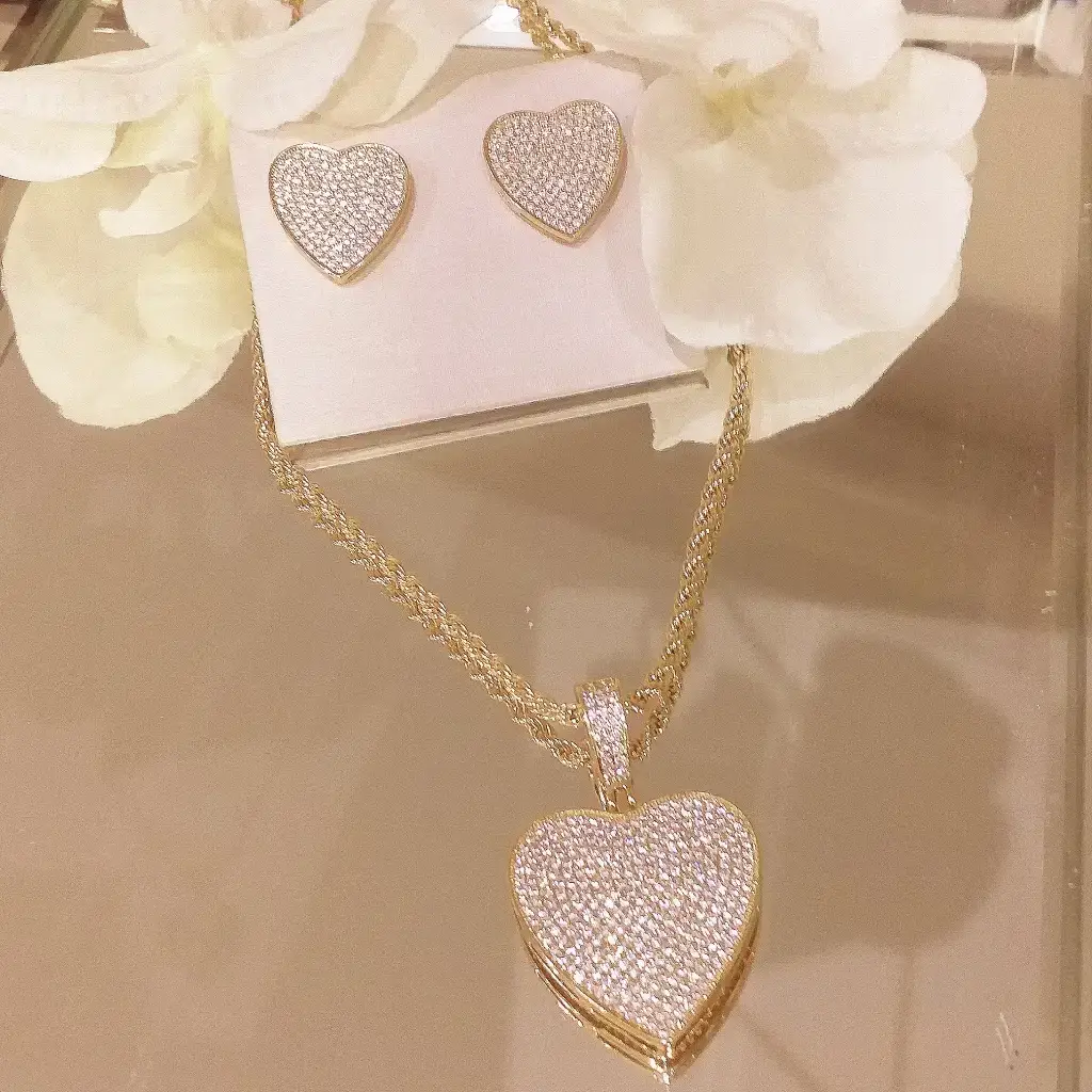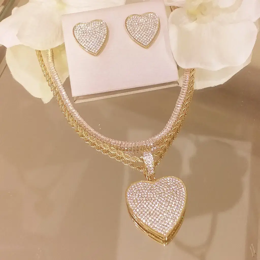 Conjunto de colar e brincos de coração zircônia banhado em ouro 18kTamanho: 40cm + 5 cm de extensor(a riviera de baguete é somente uma sugestão de composição e não faz parte do conjunto)