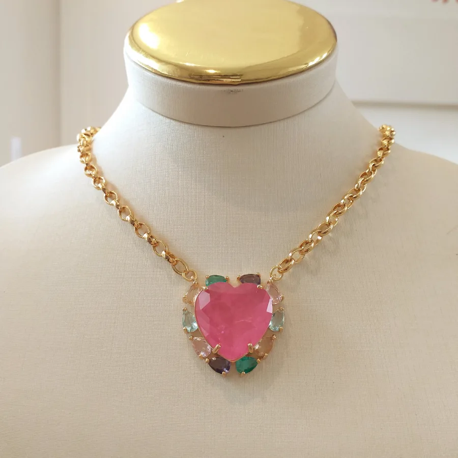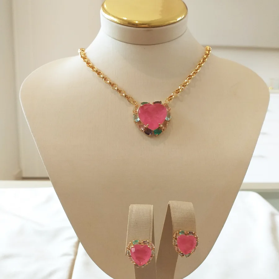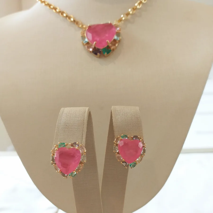 Conjunto de coração em zircônia fusion pink banhado em ouro 18k