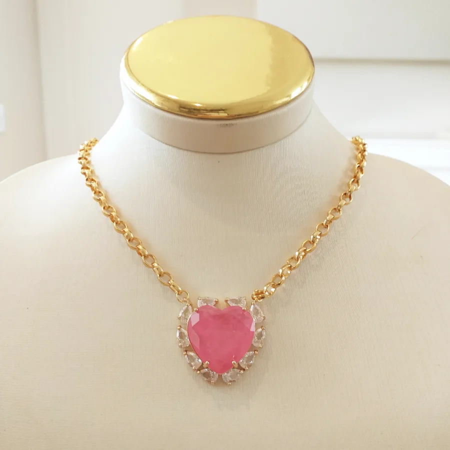 Conjunto de Colar e Brinco de coração em zircônia fusion pink banhado em ouro 18k