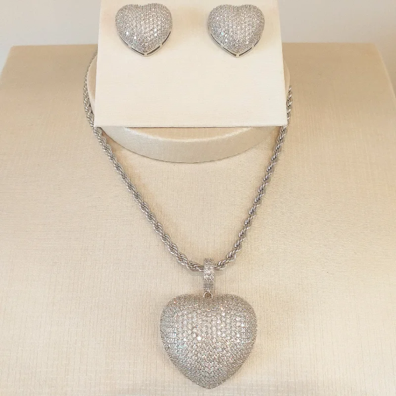 Conjunto de brinco e colar de coracao cravejado com banho de ródio.