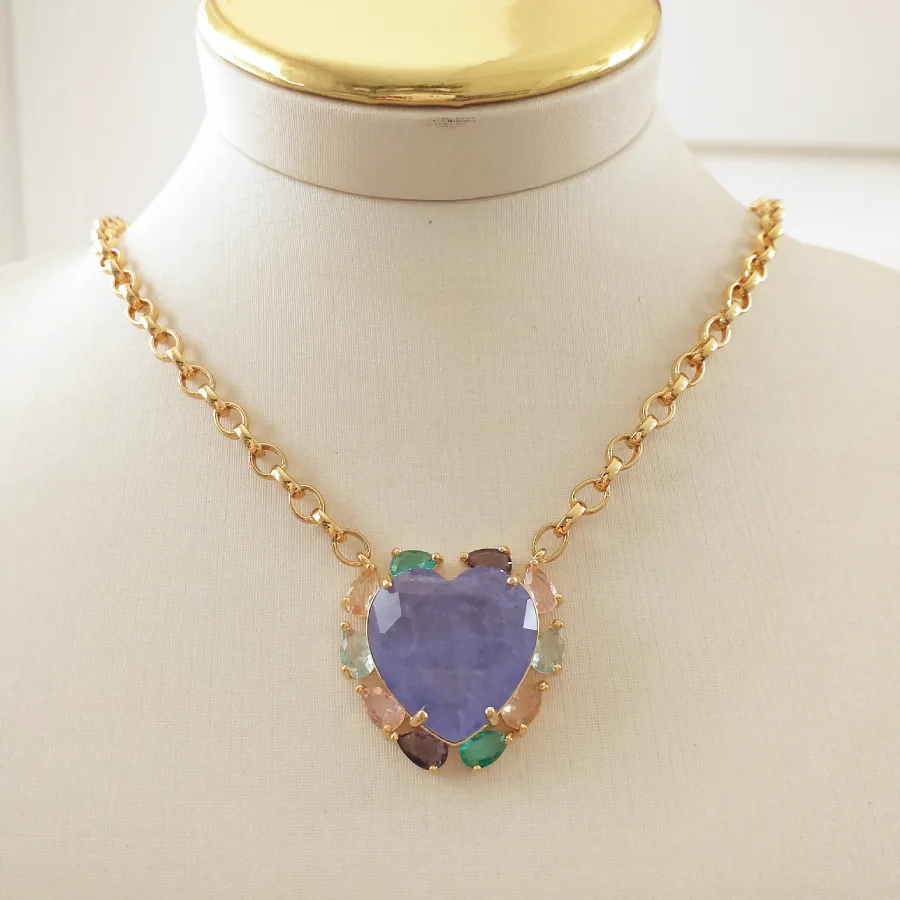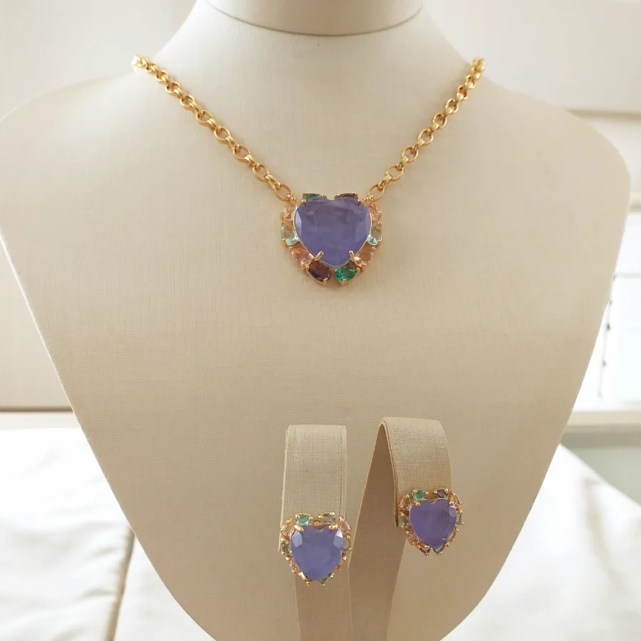 Conjunto de Colar e Brinco de coração em zircônia fusion tanzanita banhado em ouro 18k
