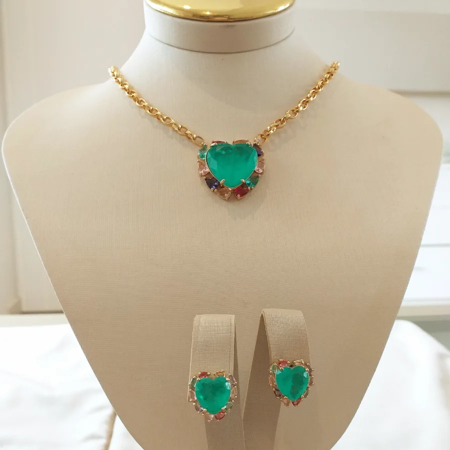 Conjunto de coracao fusion turmalina com gotinhas rainbow e corrente de elos.