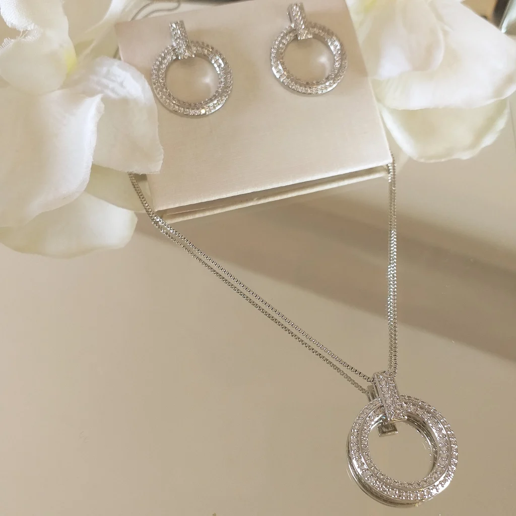 Conjunto de esferas cravejadas contendo colar e brinco banhado em ródio branco e verniz de proteção