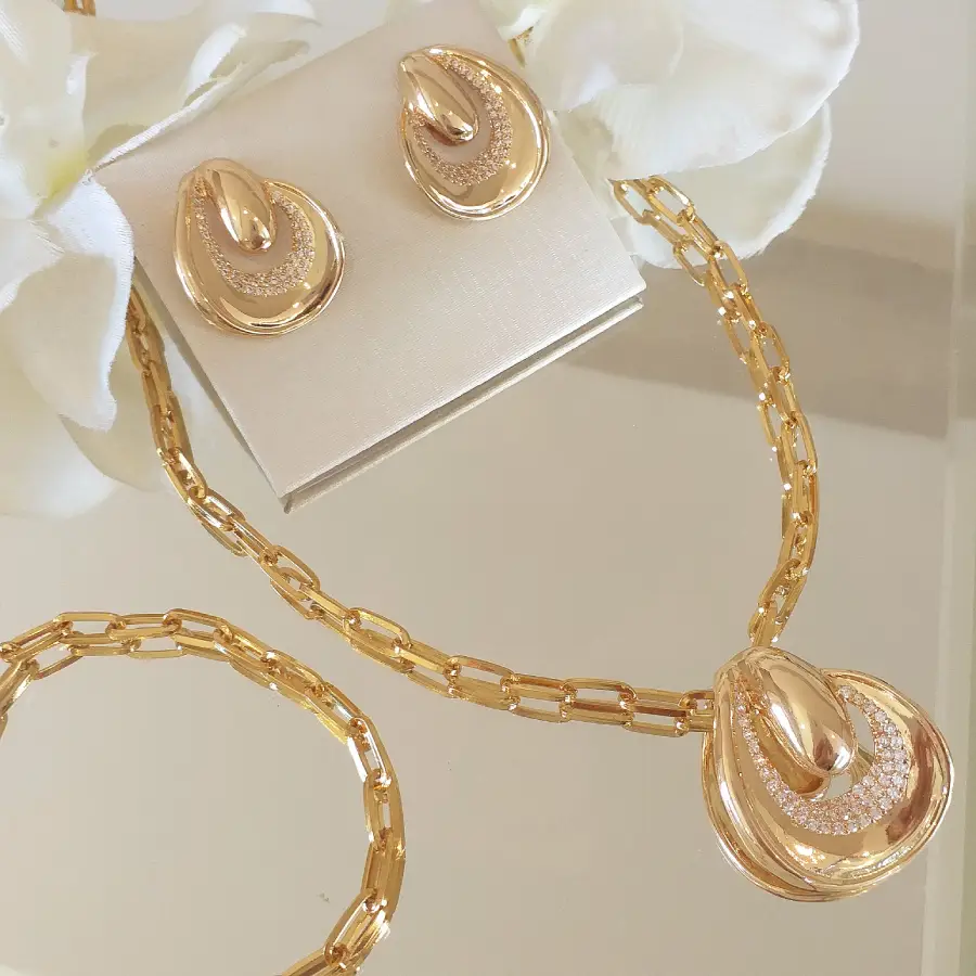 Conjunto de zircônias contendo colar e brincos banhado em ouro 18k