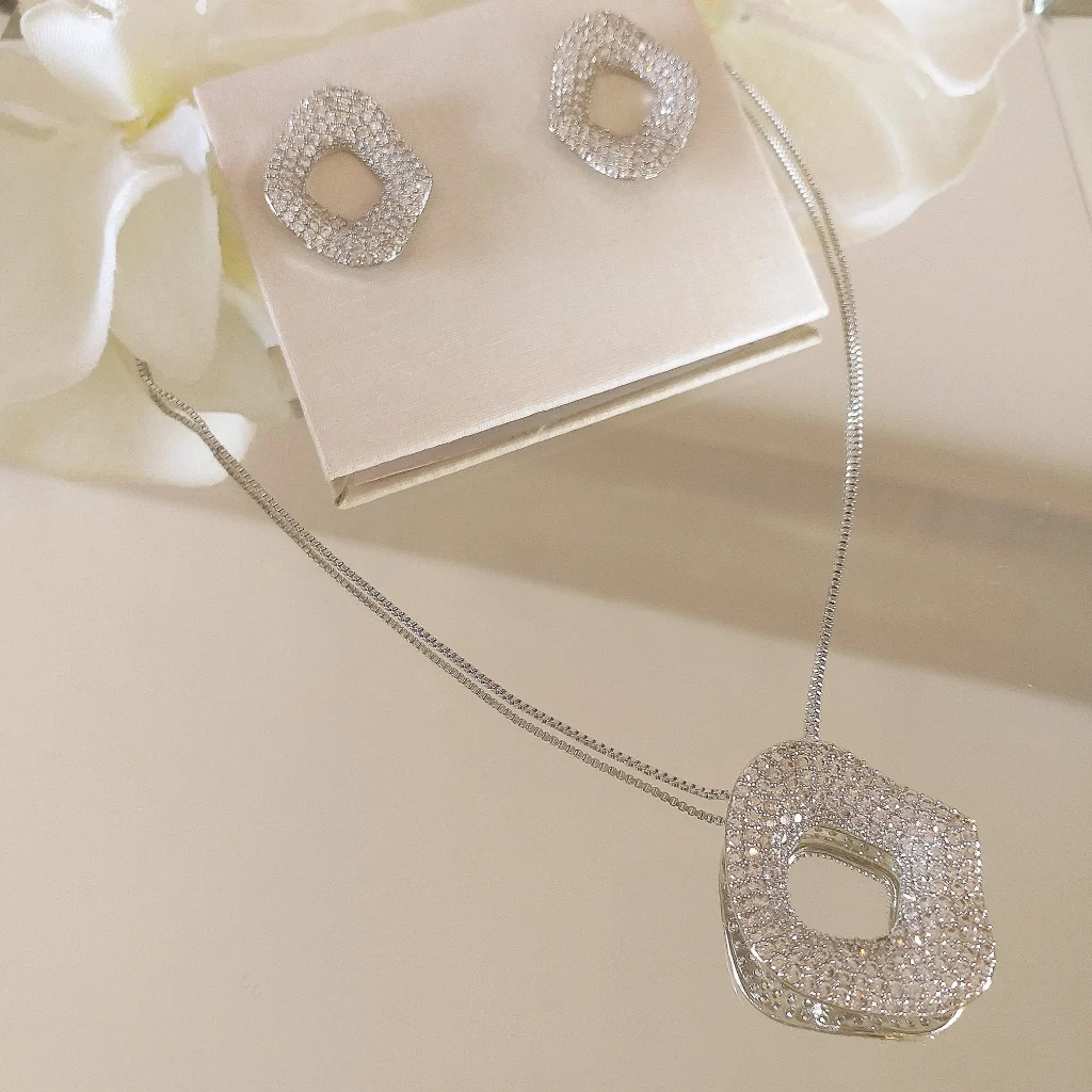 Conjunto orgânico microcravejado contendo colar e brinco banhado em ródio branco e verniz de proteção