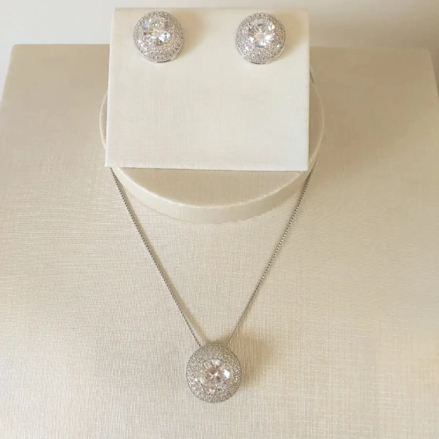 Lindo Conjunto de Colar e brincos de zircônia de elos banhado em ródio branco.