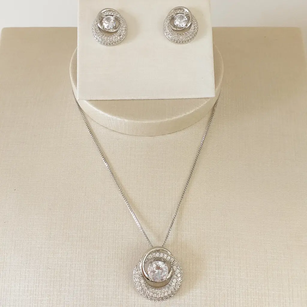 Conjunto de colar e brincos de zircônia banhado em ródio branco.Tamanho: 45cm + 5 cm de extensor