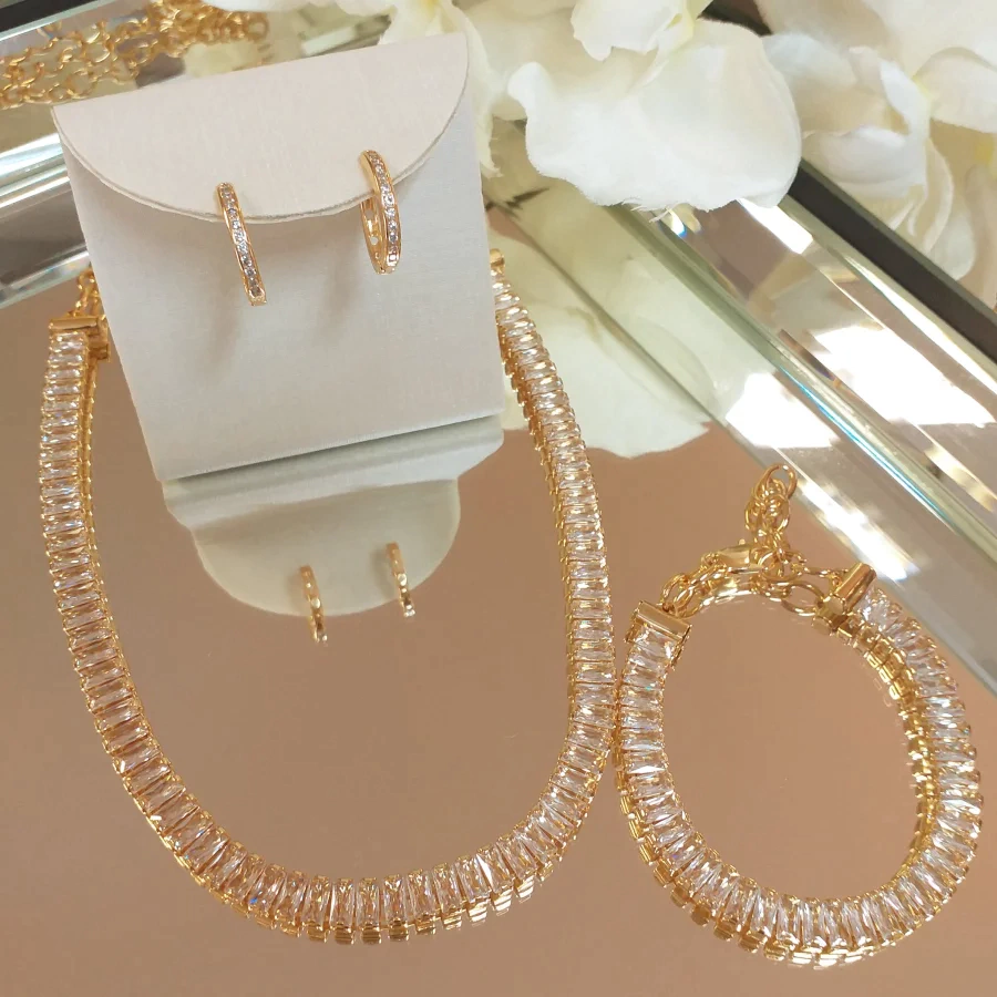 Conjunto contendo uma choker e uma pulseira de baguetes cristais. Choker ajustavel até 45 cm. Pecas banhadas em ouro 18K