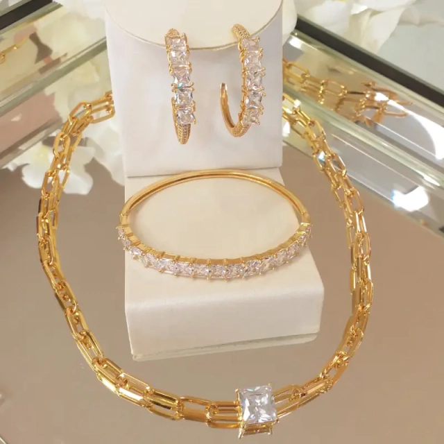 Conjunto de colar, brincos e bracelete de carré cristal. (Peça banhada em ouro 18k)