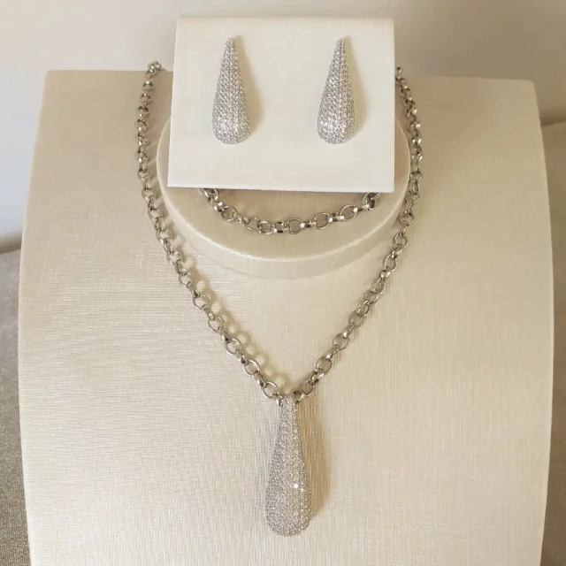 Lindo Conjunto de Colar e brincos de zircônia de elos banhado em ródio branco.