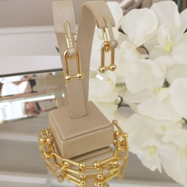 Conjunto inspiracão de grande joalheria de luxo. Simplesmente divino. Banhado em ouro 18k e verniz cataforético (Pulseira 20 cm no total e brincos 3.5 cm)