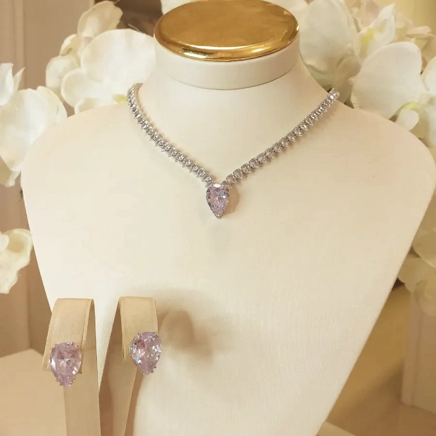 Belíssimo conjunto de riviera com pedras lapidadas em forma de gota e par de brincos de gota em zircônias cristal.