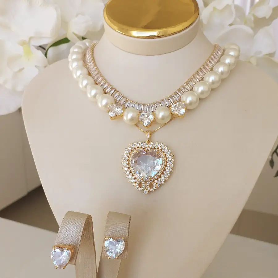 Brinco Coração ,Choker Baguete ,Colar Coração ,Colar de pérolas |