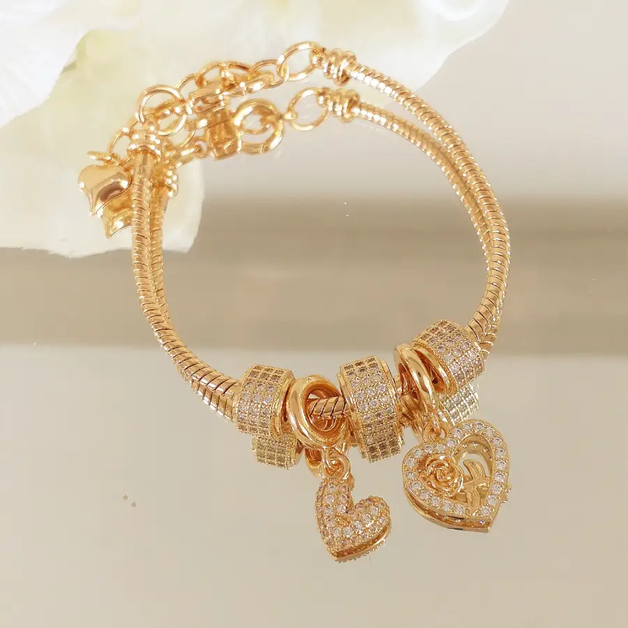 Linda pulseira estilo Pandora com berloque de coração cravejado com zircônias banhada em ouro 18k e verniz.