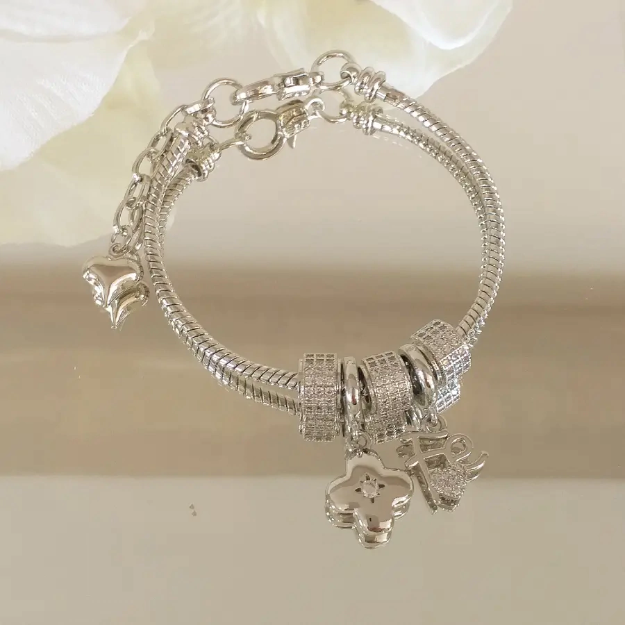Linda pulseira estilo Pandora com berloque de trevo e fé cravejado com zircônias banhada em ródio branco e verniz.