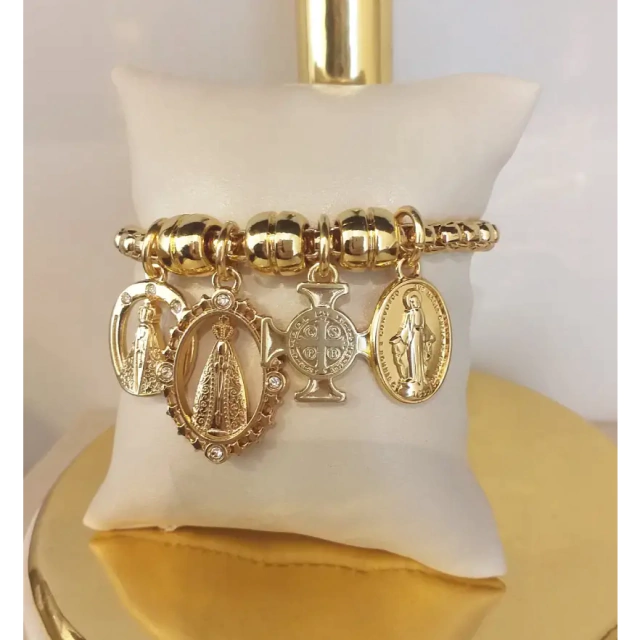 Belíssima Pulseira com 4 berloques religiosos, banhada em ouro 18k, com 17cm e 5 cm de extensor.