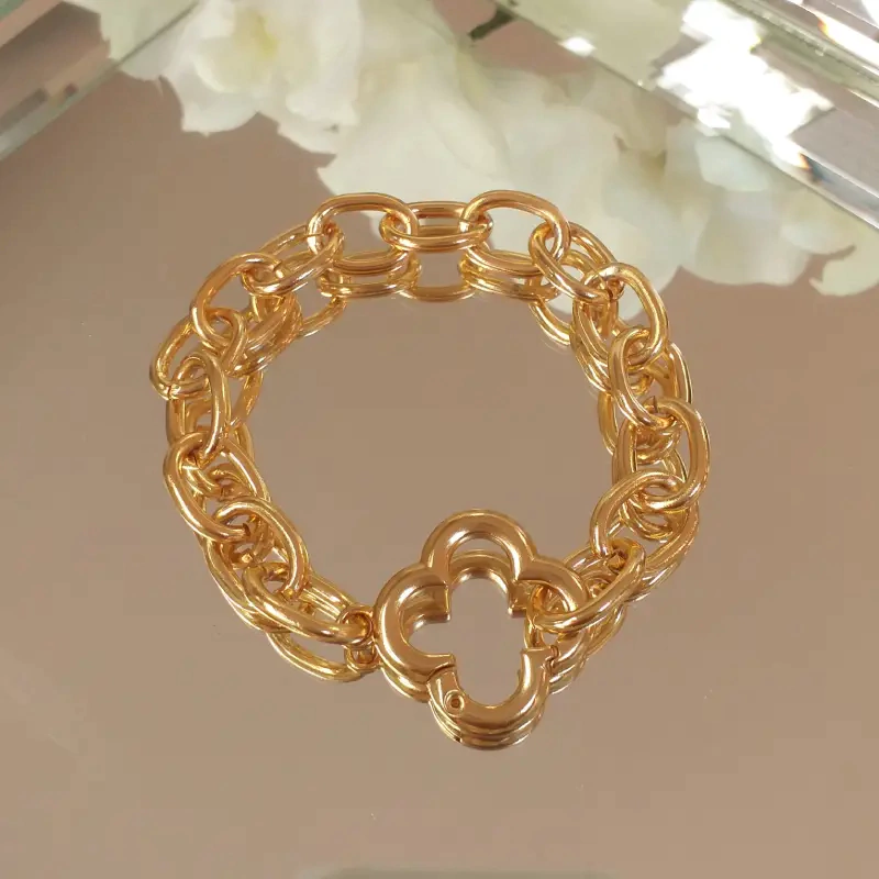 Pulseira de elos com mosquetão inspirado em marca de luxo. 19 cm sem extensor.