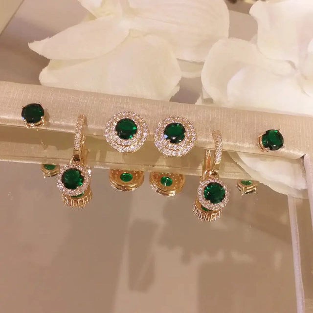 Trio de brincos de esferas cravejadas em zircônias esmeralda banhada em rouro 18k