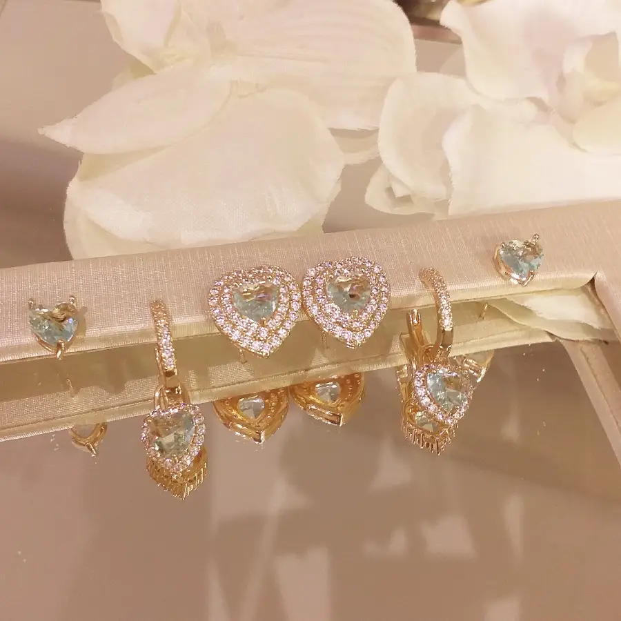 Trio de brincos de zircônia de coração água marinha banhado em ouro 18k