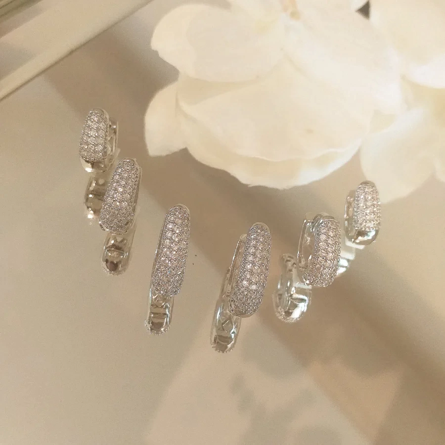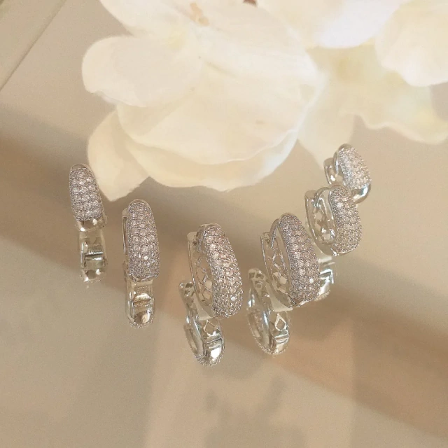 Trio de argolas microcravejadas em zircônias e banho de ródio.
