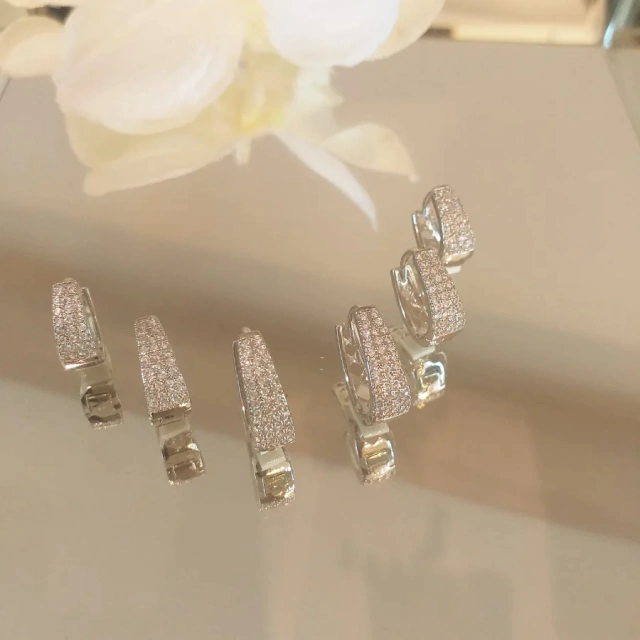 Trio de argolas microcravejadas em zircônias e banho de ródio.